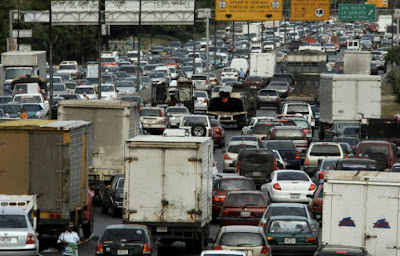 Having recently heard some griping about the "heavy" traffic in our area, I laughed when I accidentally came across this picture of the area right outside of the airport at Caracas, Venezuela. To me, this is nightmarish traffic, and there is no